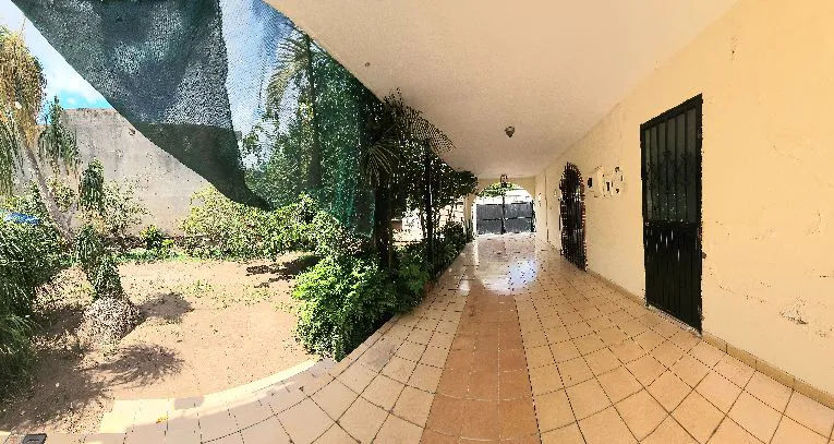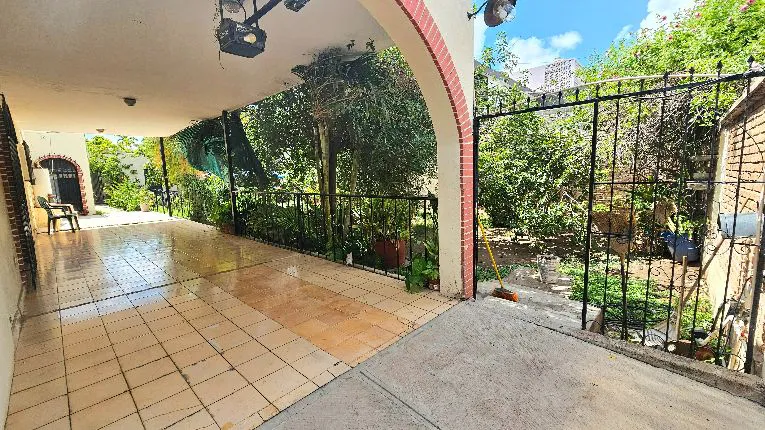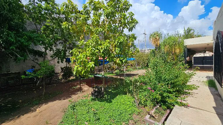 Amplio patio con árboles frutales y plantas.
